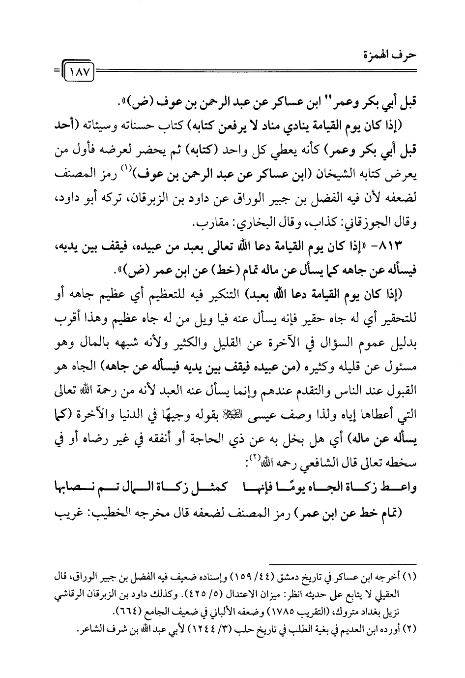 813 - " إذا كان يوم القيامة دعا الله تعالى بعبد من عبيده فيقف بين يديه، فيسأله عن جاهه كما يسأل عن ماله تمام (خط) عن ابن عمر (ض) ".