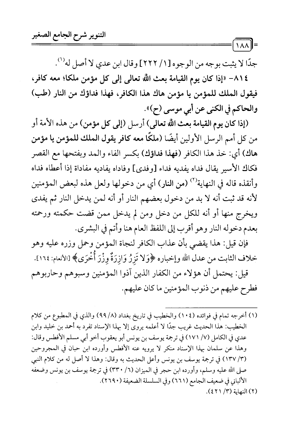 814 - " إذا كان يوم القيامة بعث الله تعالى إلى كل مؤمن ملكا؛ معه كافر، فيقول الملك للمؤمن يا مؤمن هاك هذا الكافر، فهذا فداؤك من النار (طب) والحاكم في الكنى عن أبي موسى (ح) ".