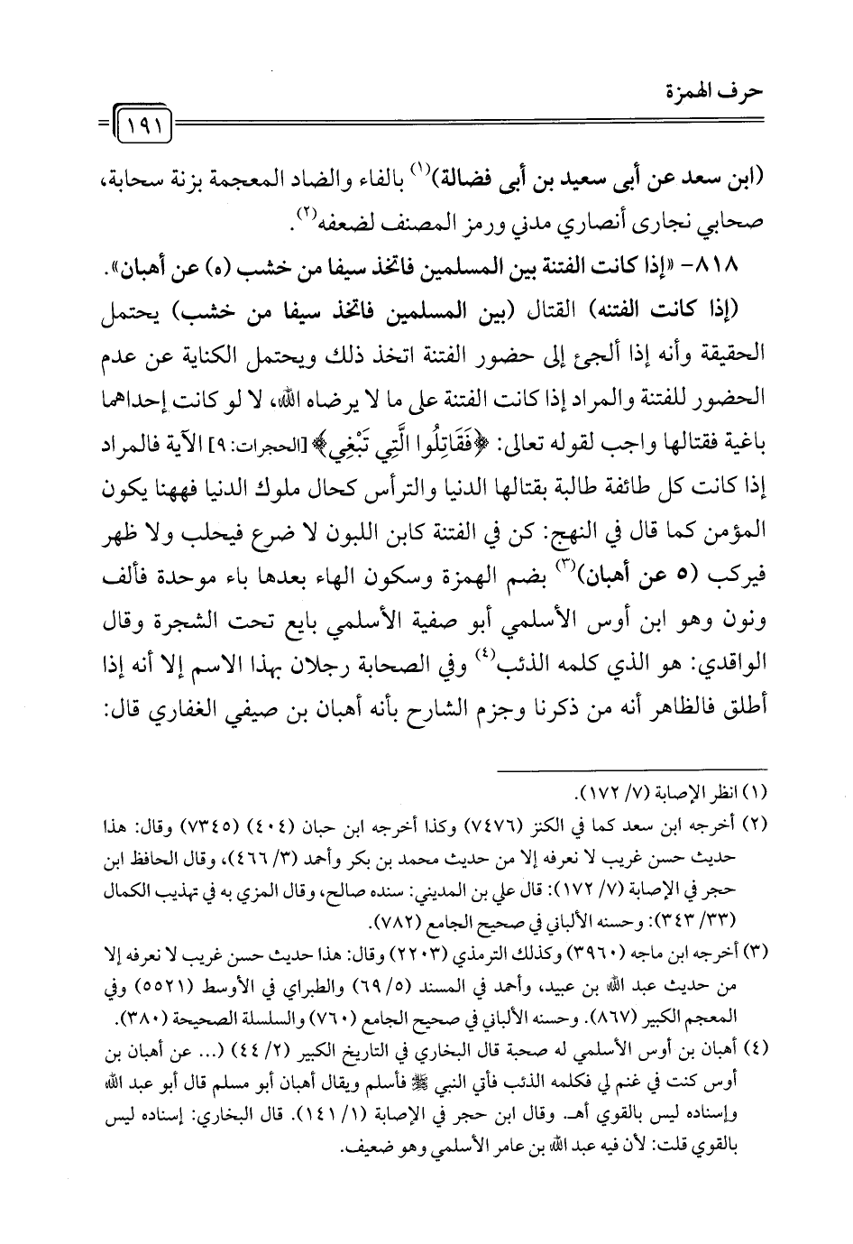 818 - " إذا كانت الفتنة بين المسلمين فاتخذ سيفًا من خشب (هـ) عن أهبان".