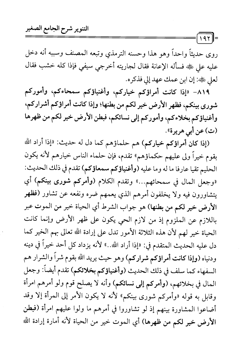 (إذا كان أمراؤكم خياركم) هم حلماؤهم كما دل له حديث: "إذا أراد الله بقوم خيراً ولى عليهم حكماؤهم" تقدم، فإن حلماء الناس خيارهم لأنه يكون الحليم تقيا عارفا ما له وما عليه (وأغنياؤكم سمعاؤكم) تقدم في ذلك الحديث: "وجعل المال في سمحائهم ... " وتقدم الكلام (وأمركم شورى بينكم) أي يتشاورون فيه ولا يخلفون أمرهم الذي يعمهم ضره ونفعه عن تشاور (فظهر الأرض خير لكم من بطنها) هو جواب الشرط أي الحياة خير من الموت عبر باللازم عن الملزوم إذ من لازم الحي يكون على ظهر الأرض وإنما كانت الحياة خير لهم لأن هذه الثلاثة الأمور تدل على إرادة الله تعالى بهم الخير كما دل عليه الحديث المتقدم في: "إذا أراد الله .. " لأنه يزداد كل أحد خيراً في دينه ودنياه (وإذا كانت أمراؤكم شراركم) وهو حيث يريد الله بقوم شراً والشرار هم السفهاء كما سلف في ذلك الحديث (وأغنياؤكم بخلائكم) تقدم أيضاً: وجعل المال في بخلائهم، (وأمركم إلى نسائكم) وأنه لا يصلح قوم ولو أمرهم امرأة وقابل به قوله "وأمركم شورى بينكم" لأنه لا يكون الأمر إلى المرأة إلا وقد أضاعوا المشاورة بينهم إذ لو تشاوروا في أمرهم ما ولوا عليهم امرأة (فبطن الأرض خير لكم من ظهرها) أي الموت خير من الحياة لأنه أمارة إرادة الله