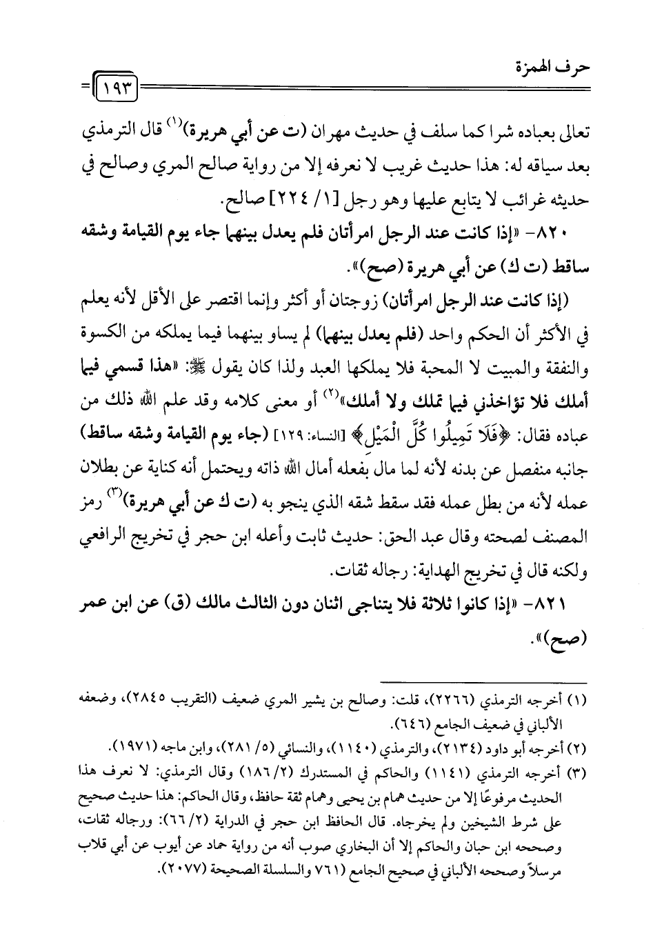 820 - " إذا كانت عند الرجل امرأتان فلم يعدل بينهما جاء يوم القيامة وشقه ساقط (ت ك) عن أبي هريرة (صح) ".