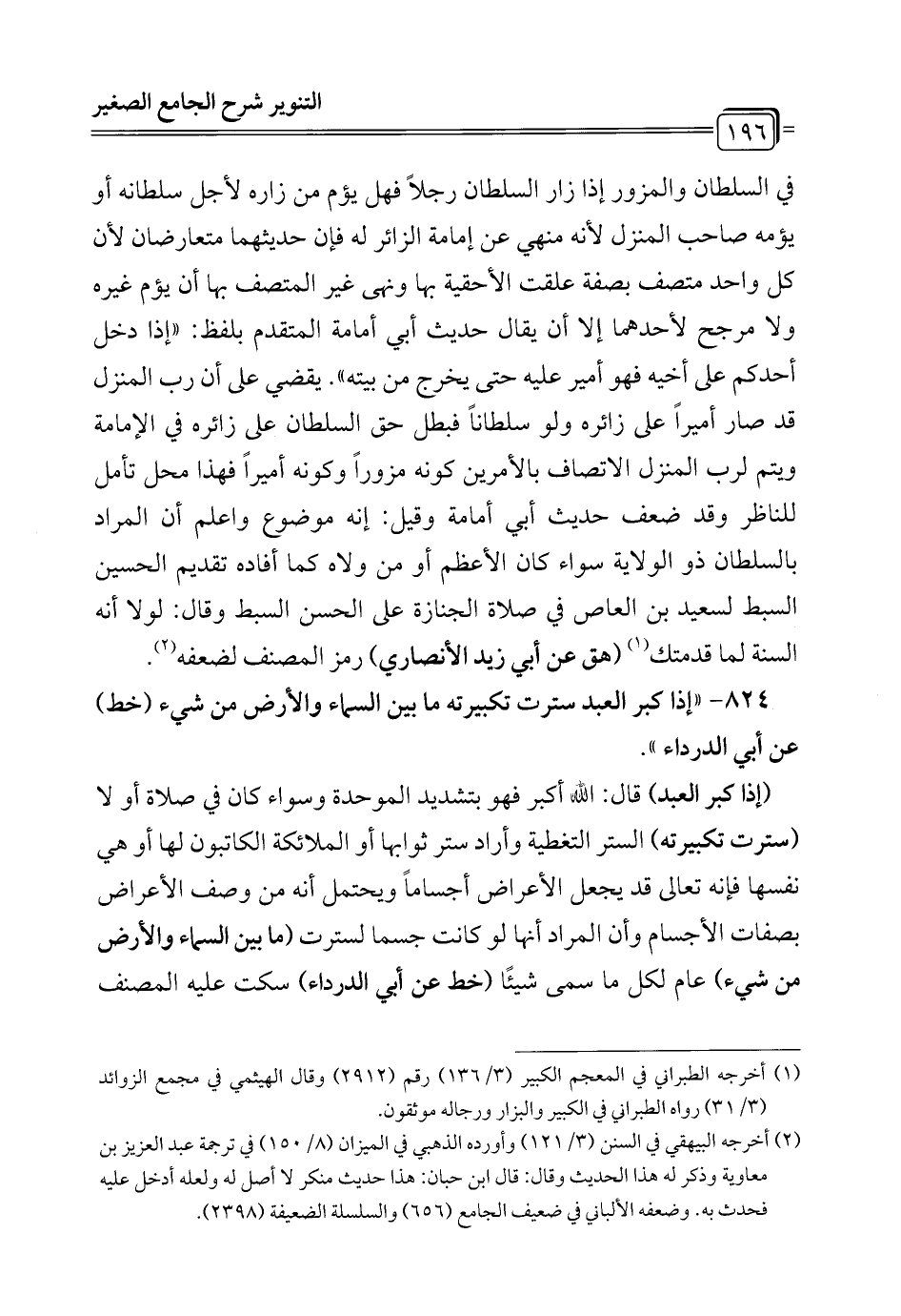 824 - " إذا كبر العبد سترت تكبيرته ما بين السماء والأرض من شيء (خط) عن أبي الدرداء".