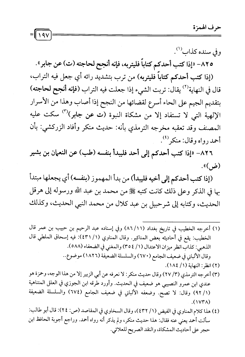 (¬3) أخرجه الترمذي (3/ 27) وقال حديث منكر: لا نعرفه عن أبي الزبير إلا من هذا الوجه, وحمزة هو عندي ابن عمرو النصيبي هو ضعيف في الحديث. وأورد طرقه ابن الجوزي في العلل المتناهية (1/ 92) وقال: لا تصح. وضعفه الألباني في ضعيف الجامع (674) والسلسلة الضعيفة (1738).