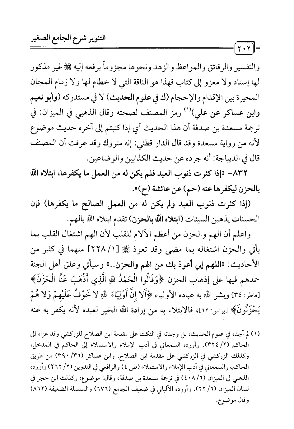 832 - " إذا كثرت ذنوب العبد فلم يكن له من العمل ما يكفرها، ابتلاه الله بالحزن ليكفرها عنه (حم) عن عائشة (ح) ".