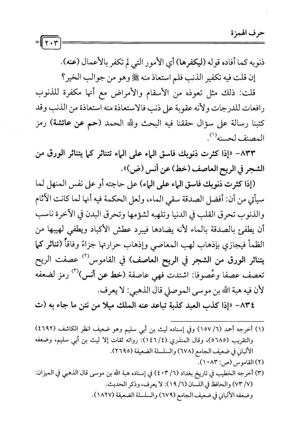 833 - " إذا كثرت ذنوبك فاسق الماء على الماء تتناثر كما يتناثر الورق من الشجر في الريح العاصف (خط) عن أنس (ض) ".