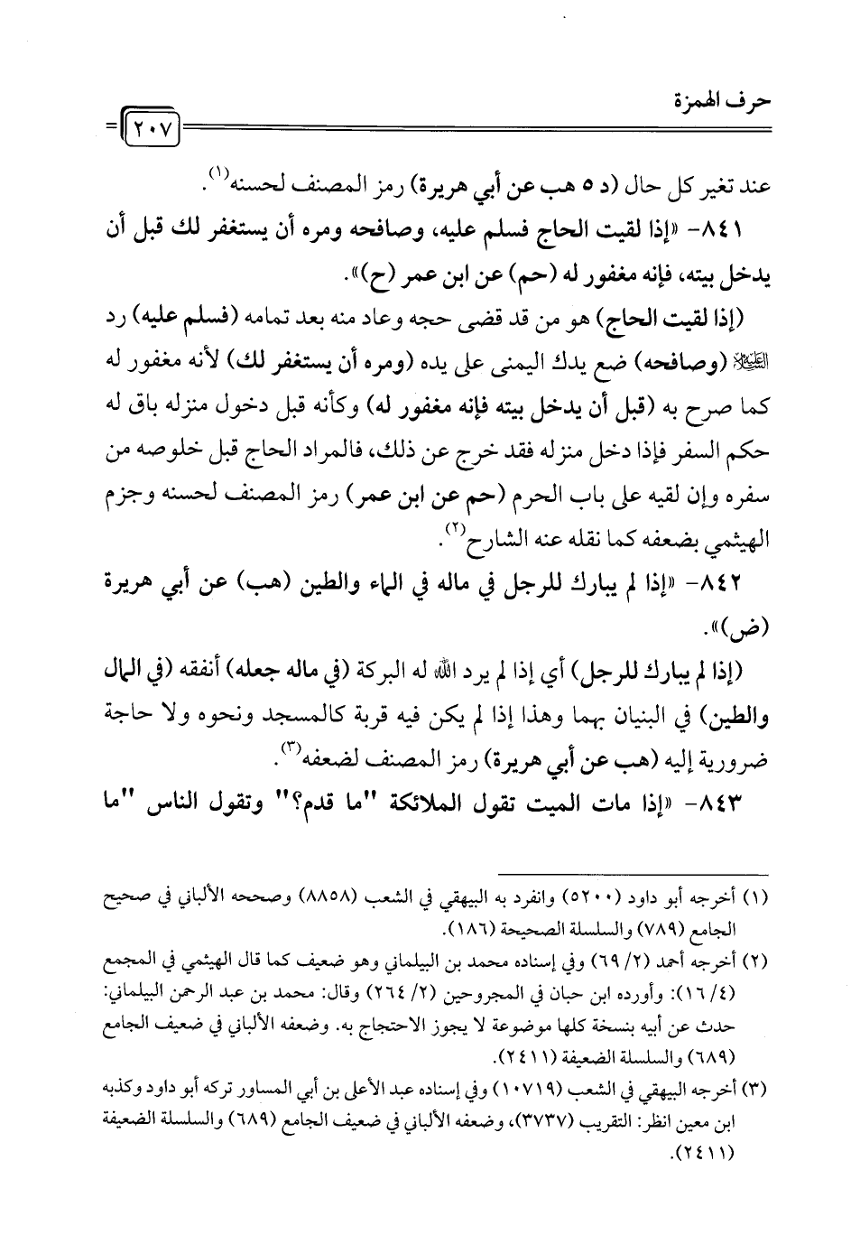 841 - "إذا لقيت الحاج فسلم عليه، وصافحه ومره أن يستغفر لك قبل أن يدخل بيته, فإنه مغفور له (حم) عن ابن عمر (ح) ".