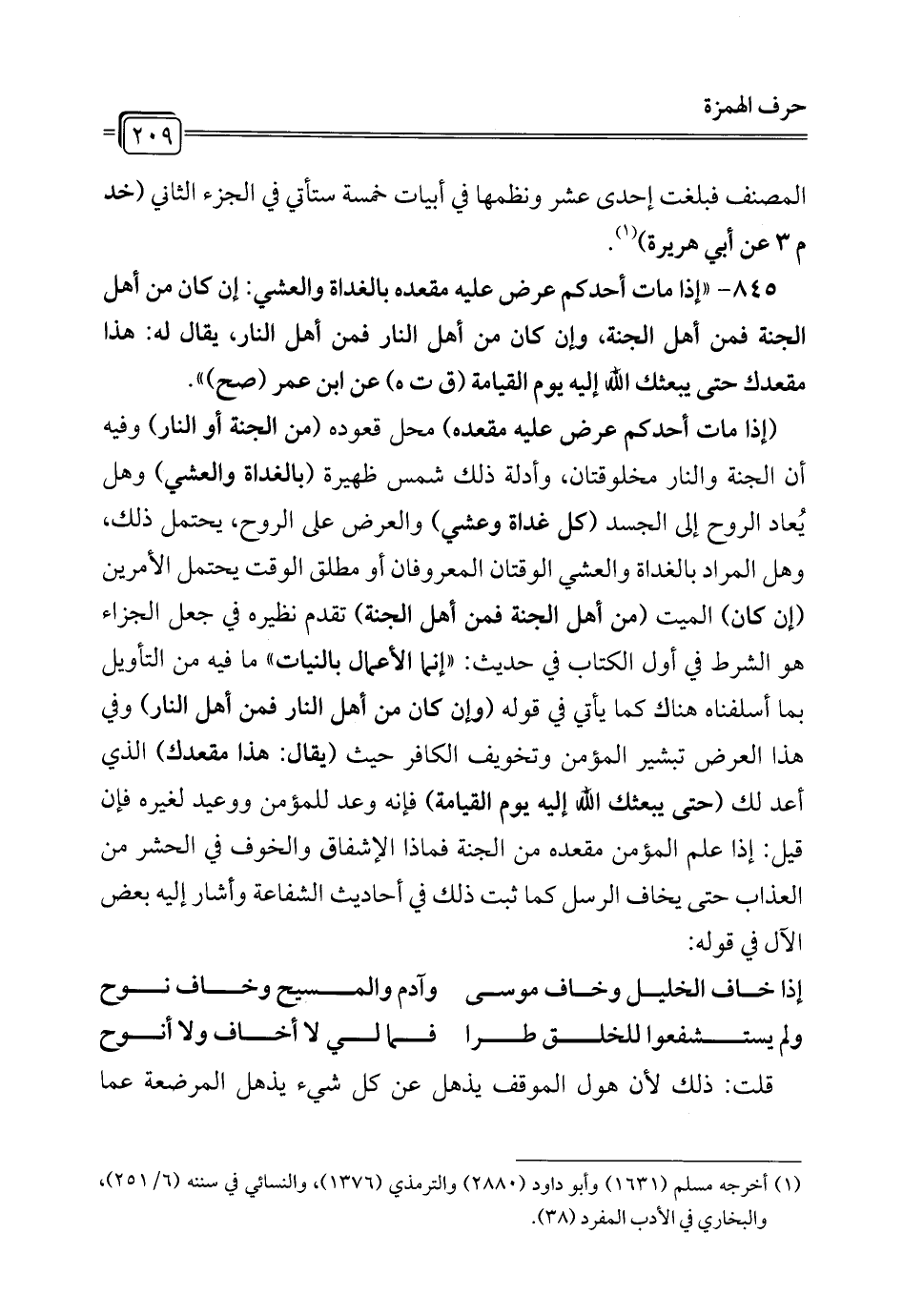 845 - " إذا مات أحدكم عرض عليه مقعده بالغداة والعشي: إن كان من أهل الجنة فمن أهل الجنة، وإن كان من أهل النار فمن أهل النار، يقال له: هذا مقعدك حتى يبعثك الله إليه يوم القيامة (ق ت هـ) عن ابن عمر (صح) ".
