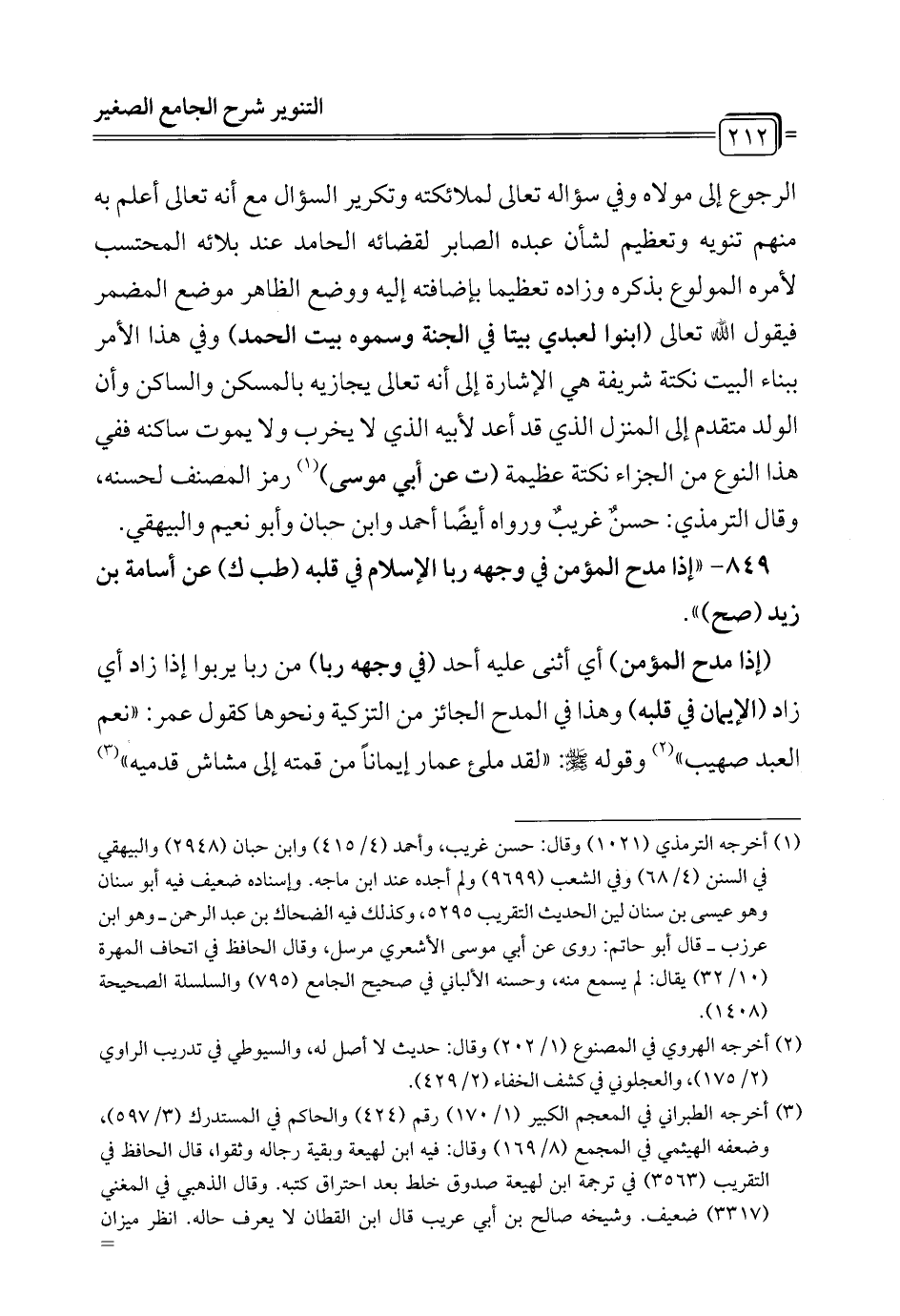 849 - " إذا مدح المؤمن في وجهه ربا الإِسلام في قلبه (طب ك) عن أسامة بن زيد (صح) ".