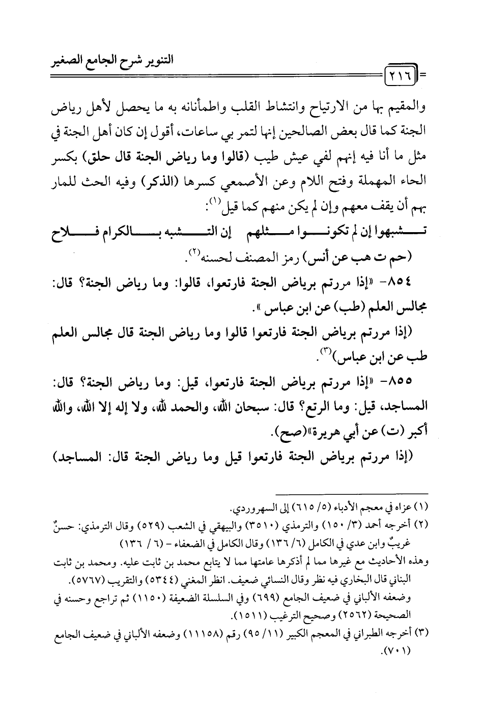 855 - " إذا مررتم برياض الجنة فارتعوا، قيل: وما رياض الجنة؟ قال: المساجد، قيل: وما الرتع؟ قال: سبحان الله، والحمد لله، ولا إله إلا الله، والله أكبر (ت) عن أبي هريرة" (صح).