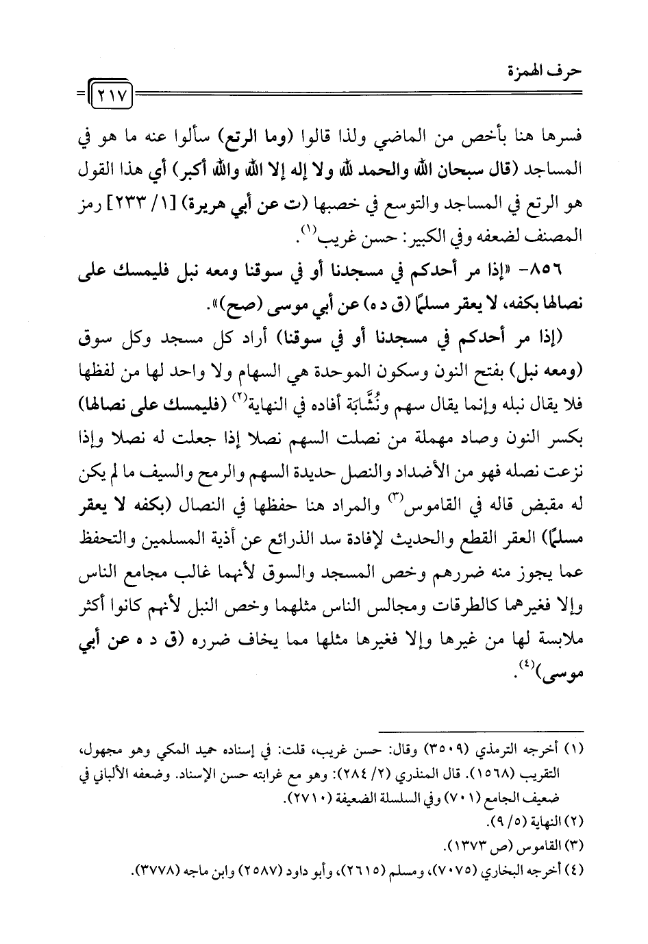 856 - " إذا مر أحدكم في مسجدنا أو في سوقنا ومعه نبل فليمسك على نصالها بكفه, لا يعقر مسلمًا (ق د هـ) عن أبي موسى (صح) ".