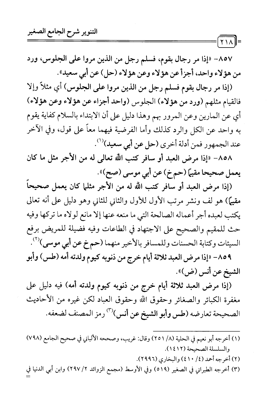 858 - " إذا مرض العبد أو سافر كتب الله تعالى له من الأجر مثل ما كان يعمل صحيحا مقيمًا (حم خ) عن أبي موسى (صح) ".