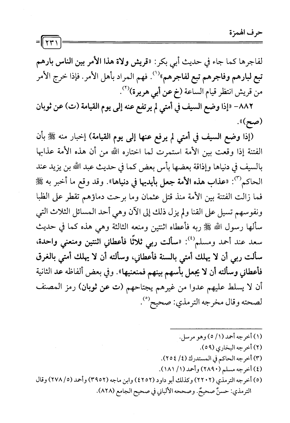 882 - " إذا وضع السيف في أمتي لم يرتفع عنه إلى يوم القيامة (ت) عن ثوبان (صح) ".