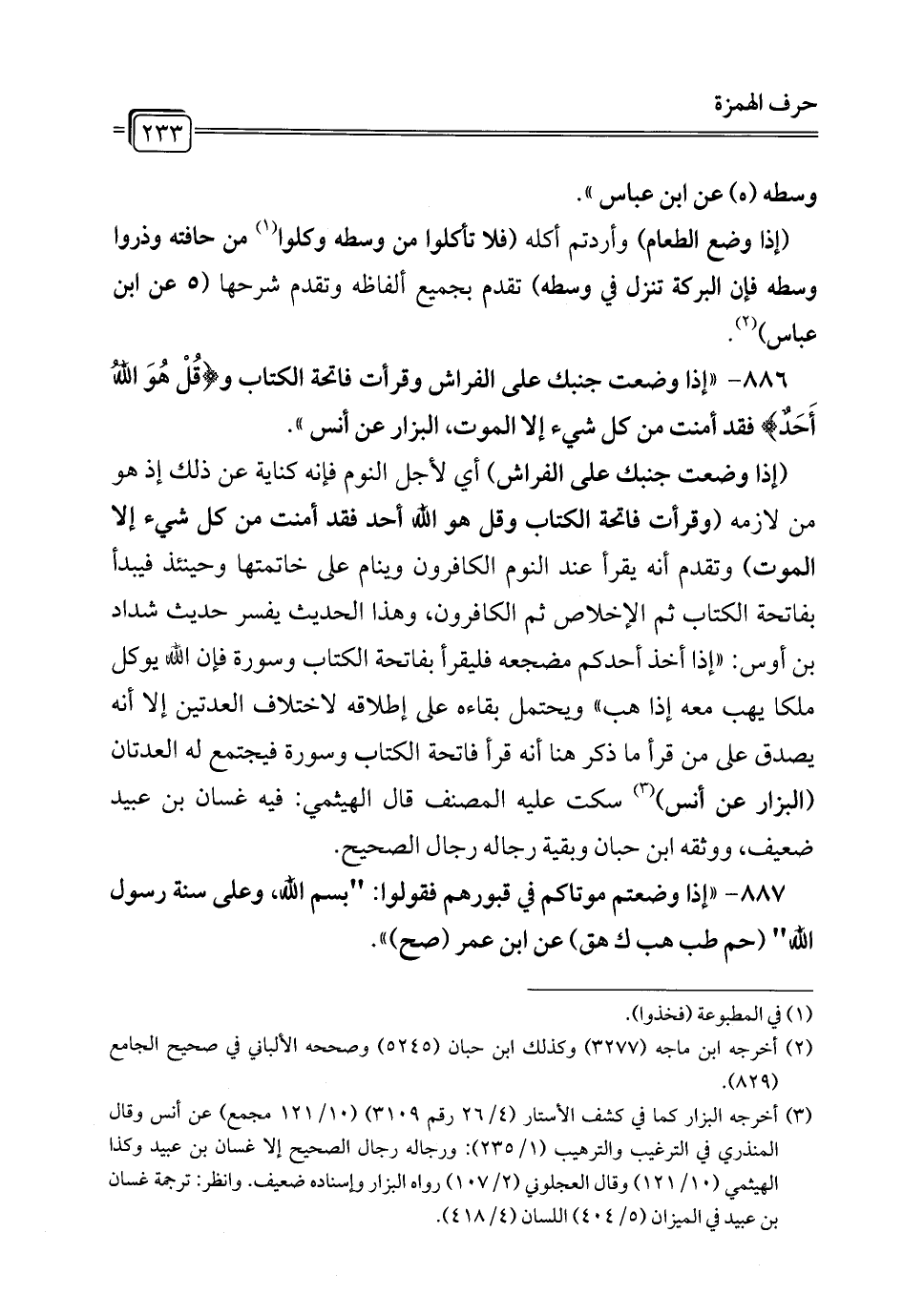 (¬3) أخرجه البزار كما في كشف الأستار (4/ 26 رقم 3109) (10/ 121 مجمع) عن أنس وقال المنذري في الترغيب والترهيب (1/ 235): ورجاله رجال الصحيح إلا غسان بن عبيد وكذا الهيثمي (10/ 121) وقال العجلوني (2/ 107) رواه البزار وإسناده ضعيف. وانظر: ترجمة غسان بن عبيد في الميزان (5/ 404) اللسان (4/ 418).