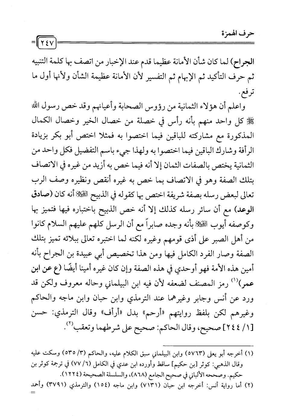 واعلم أن هؤلاء الثمانية من رؤوس الصحابة وأعيانهم وقد خص رسول الله - صلى الله عليه وسلم - كل واحد منهم بأنه رأس في خصلة من خصال الخير وخصال الكمال المذكورة مع مشاركته للباقين فيما اختصوا به فمثلا اختص أبو بكر بزيادة الرأفة وشارك الباقين فيما اختصوا به ولهذا جيء باسم التفضيل فكل واحد من الثمانية يختص بالصفات الثمان إلا أنه فيما خص به أزيد من غيره في الاتصاف بتلك الصفة وهو في الاتصاف بما خص به غيره أنقص ونظيره وصف الرب تعالى لبعض رسله بصفة شريفة اختص بها كقوله في الذبيح - عليه السلام - أنه كان (صادق الوعد) مع أن سائر رسله كذلك إلا أنه خص الذبيح باختباره فيها فتميز بها وكوصفه أيوب - عليه السلام - بأنه وجده صابراً مع أن الرسل كلهم عليهم السلام كانوا من أهل الصبر على أذى قومهم وغيره لكنه لما اختبره تعالى ببلائه تميز بتلك الصفة وصار الفرد الكامل فيها ومن هذا تخصيص أبي عبيدة بن الجراح بأنه أمين هذه الأمة فهو أوحدي في هذه الصفة وإن كان غيره أمينًا أيضًا (ع عن ابن عمر) (¬1) رمز المصنف لضعفه لأن فيه ابن البيلماني وحاله معروف ولكن قد ورد عن أنس وجابر وغيرهما عند الترمذي وابن حبان وابن ماجه والحاكم وغيرهم لكن بلفظ روايتهم "أرحم" بدل "أرأف" وقال الترمذي: حسن [1/ 244] صحيح، وقال الحاكم: صحيح على شرطهما وتعقب (¬2).