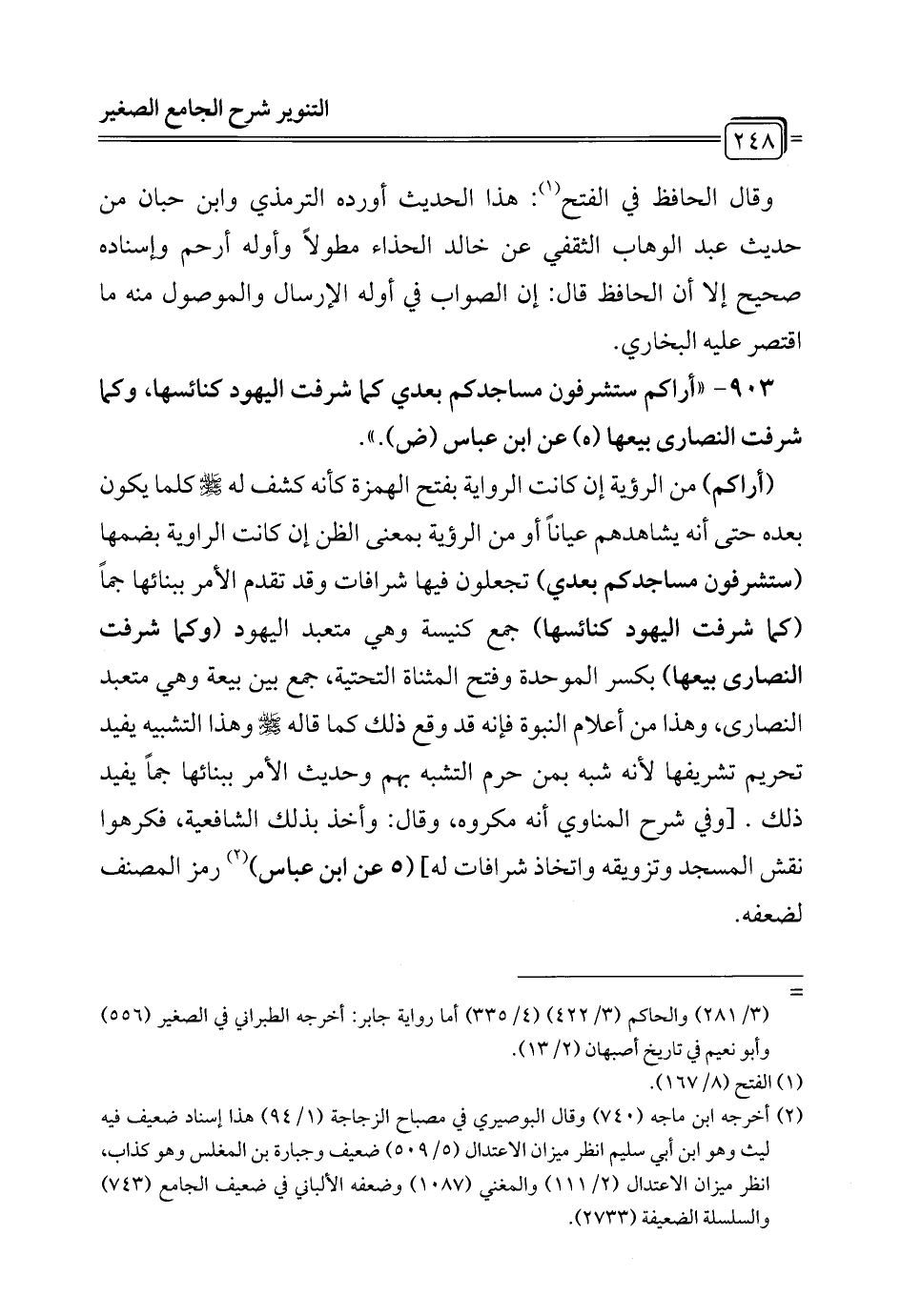 903 - "أراكم ستشرفون مساجدكم بعدي كما شرفت اليهود كنائسها، وكما شرفت النصارى بيعها (هـ) عن ابن عباس (ض).".