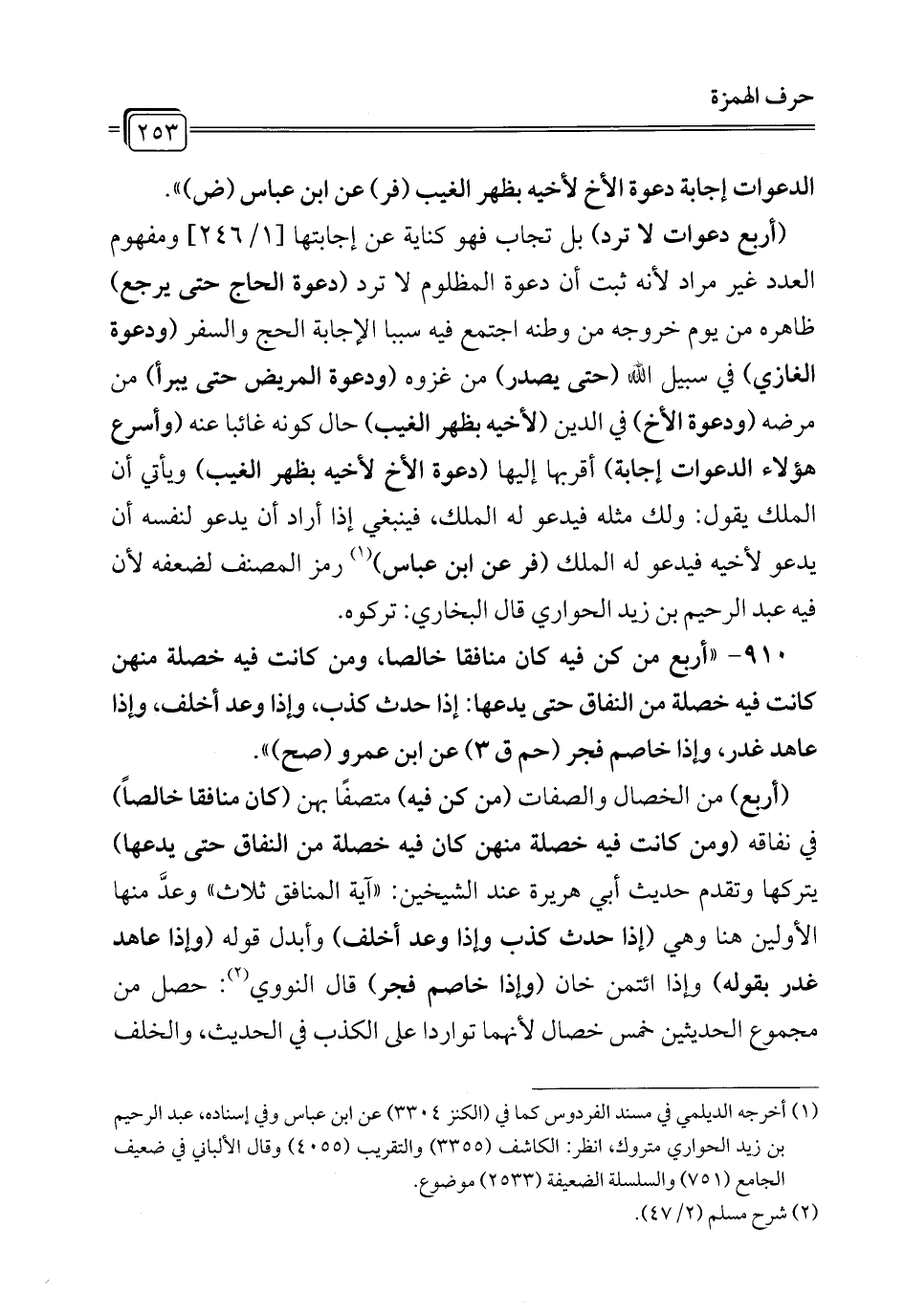 910 - "أربع من كن فيه كان منافقًا خالصًا، ومن كانت فيه خصلة منهن كانت فيه خصلة من النفاق حتى يدعها: إذا حدث كذب وإذا وعد أخلف, وإذا عاهد غدر، وإذا خاصم فجر (حم ق 3) عن ابن عمرو (صح) ".