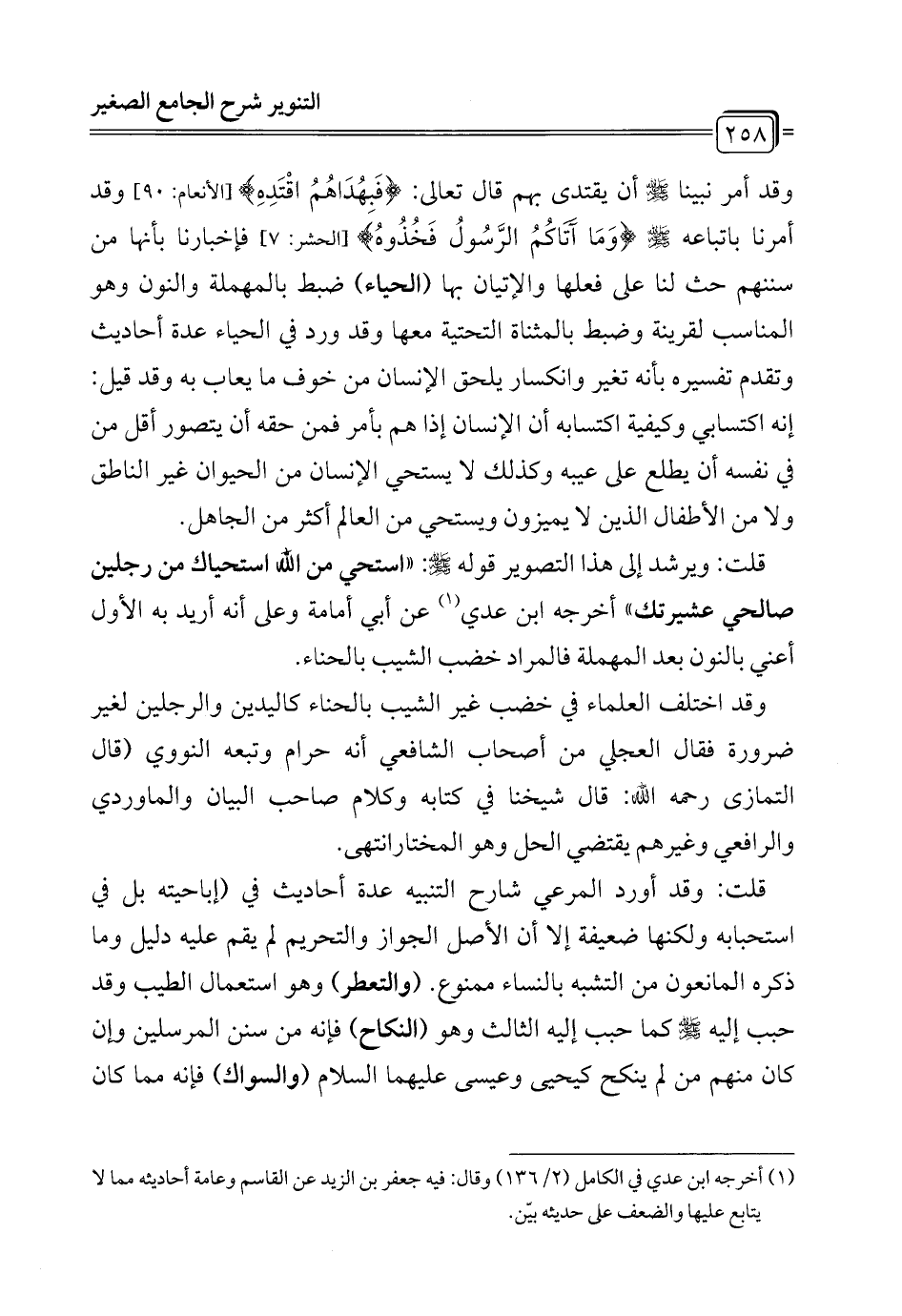 وقد أمر نبينا - صلى الله عليه وسلم - أن يقتدى بهم قال تعالى: {فَبِهُدَاهُمُ اقْتَدِهْ} [الأنعام: 90] وقد أمرنا باتباعه - صلى الله عليه وسلم - {وَمَا آتَاكُمُ الرَّسُولُ فَخُذُوهُ} [الحشر: 7] فإخبارنا بأنها من سننهم حث لنا على فعلها والإتيان بها (الحياء) ضبط بالمهملة والنون وهو المناسب لقرينة وضبط بالمثناة التحتية معها وقد ورد في الحياء عدة أحاديث وتقدم تفسيره بأنه تغير وانكسار يلحق الإنسان من خوف ما يعاب به وقد قيل: إنه اكتسابي وكيفية اكتسابه أن الإنسان إذا هم بأمر فمن حقه أن يتصور أقل من في نفسه أن يطلع على عيبه وكذلك لا يستحي الإنسان من الحيوان غير الناطق ولا من الأطفال الذين لا يميزون ويستحي من العالم أكثر من الجاهل.