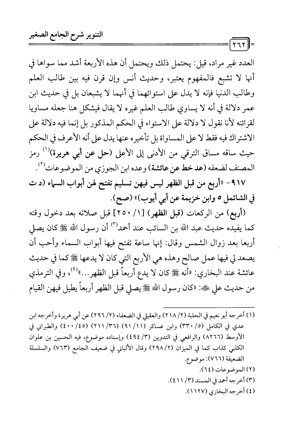 917 - "أربع من قبل الظهر ليس فيهن تسليم تفتح لهن أبواب السماء (د ت في الشائمل 5 وابن خزيمة عن أبي أيوب) " (صح).