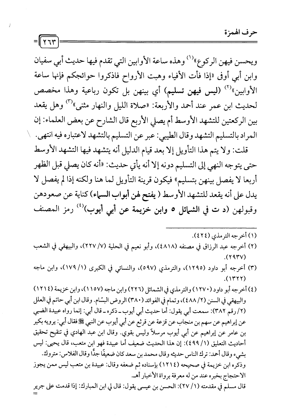 (¬4) أخرجه أبو داود (1270) والترمذي في الشمائل (226) وابن ماجه (1157)، وابن خزيمة (1214) والبيهقي في السنن (2/ 488)، وتمام في الفوائد (380) الروض البسّام. وقال ابن أبي حاتم في العلل (2/ رقم 382): سمعت أبي يقول: أما حديث أبي أيوب -ذكره- قال أبي: إنما رواه عبيدة الضبي عن إبراهيم عن سهم بن منجاب عن قزعة عن قرثع عن أبي أيوب عن النبي - صلى الله عليه وسلم - فقال أبي: يرويه بكير بن عامر عن إبراهيم عن أبي أيوب مرسلاً وليس بقوي. وقال ابن عبد الهادي في تنقيح تحقيق أحاديث التعليق (1/ 499): إن هذا الحديث ضعيف أما عبيدة بن متعب، قال يحيى: ليس بشيء وقال أحمد: ترك الناس حديثه وقال محمَّد بن سعد كان ضعيفاً جدًّا وقال الفلاس: متروك.