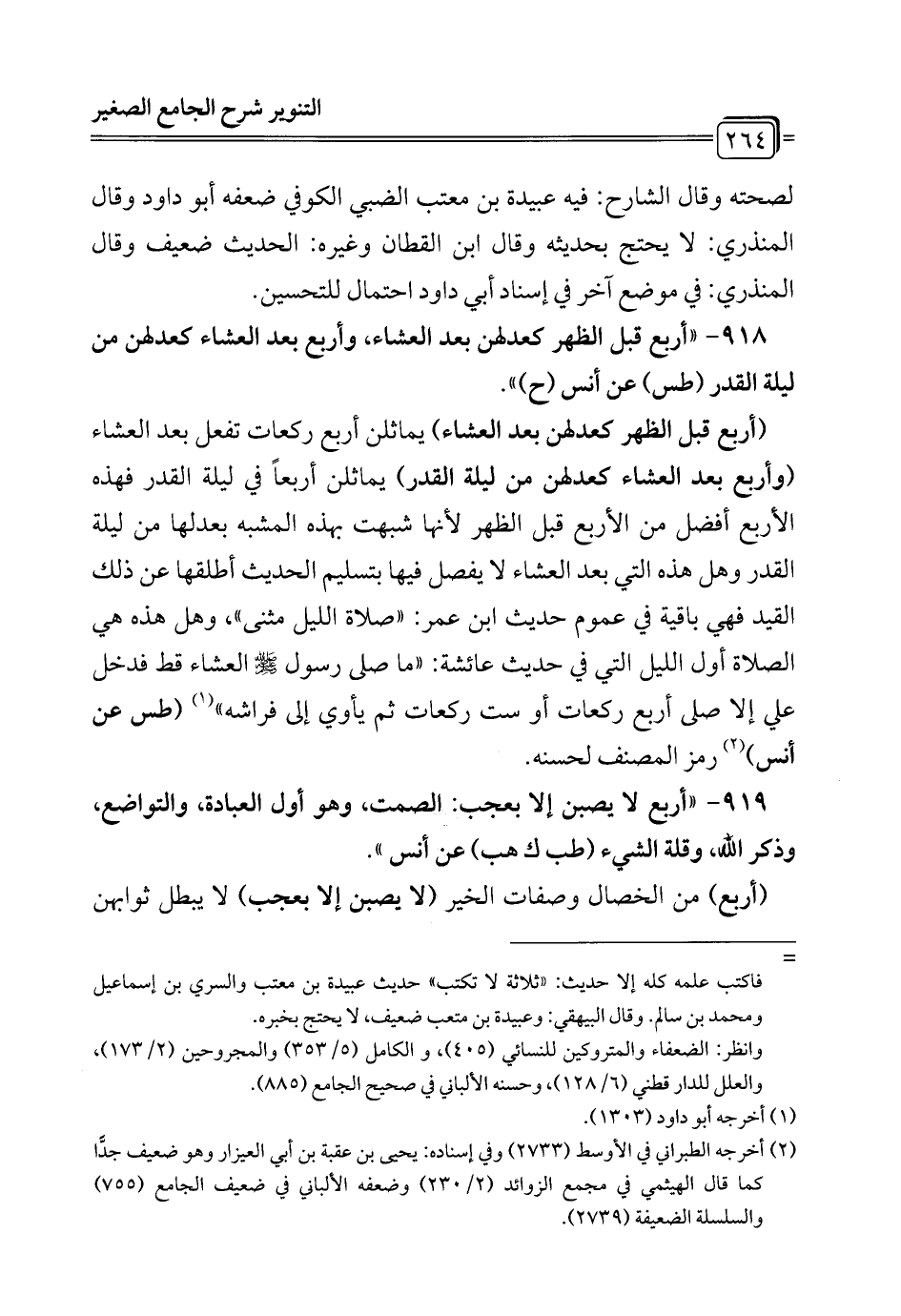 918 - "أربع قبل الظهر كعدلهن بعد العشاء، وأربع بعد العشاء كعدلهن من ليلة القدر (طس) عن أنس (ح) ".