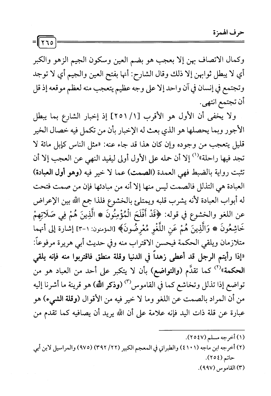 ولا يخفى أن الأول هو الأقرب [1/ 251] إذ إخبار الشارع بما يبطل الأجور وبما يحصلها هو الذي بعث له الإخبار بأن من تكمل فيه خصال الخير قليل يتعجب من وجوده وإن كان هذا قد جاء عنه: "مثل الناس كإبل مائة لا تجد فيها راحلة" (¬1) إلا أن حمله على الأول أولى ليفيد النهي عن العجب إلا أن تثبت رواية بالضبط فهي العمدة (الصمت) عما لا خير فيه (وهو أول العبادة) العبادة هي التذلل فالصمت ليس منها إلا أنه من مبادئها فإن من صمت فتحت له أبواب العبادة لأنه يشرب قلبه ويمتلئ بالخشوع فلذا جمع الله بين الإعراض عن اللغو والخشوع في قوله: {قَدْ أَفْلَحَ الْمُؤْمِنُونَ (1) الَّذِينَ هُمْ فِي صَلَاتِهِمْ خَاشِعُونَ (2) وَالَّذِينَ هُمْ عَنِ اللَّغْوِ مُعْرِضُونَ} [المؤمنون: 1 - 3] إشارة إلى أنهما متلازمان ويلقي الحكمة فيحسن الاقتراب منه وفي حديث أبي هريرة مرفوعاً: "إذا رأيتم الرجل قد أعطى زهداً في الدنيا وقلة منطق فاقتربوا منه فإنه يلقي الحكمة" (¬2) كما تقدَّم (والتواضع) بأن لا يتكبر على أحد من العباد هو من تواضع إذا تذلل وتخاشع كما في القاموس (¬3) (وذكر الله) هو قرينة ما أشرنا إليه من أن المراد بالصمت عن اللغو وما لا خير فيه من الأقوال (وقلة الشيء) هو عبارة عن قلة ذات اليد فإنه علامة على أن الله يريد أن يصافيه كما تقدم من