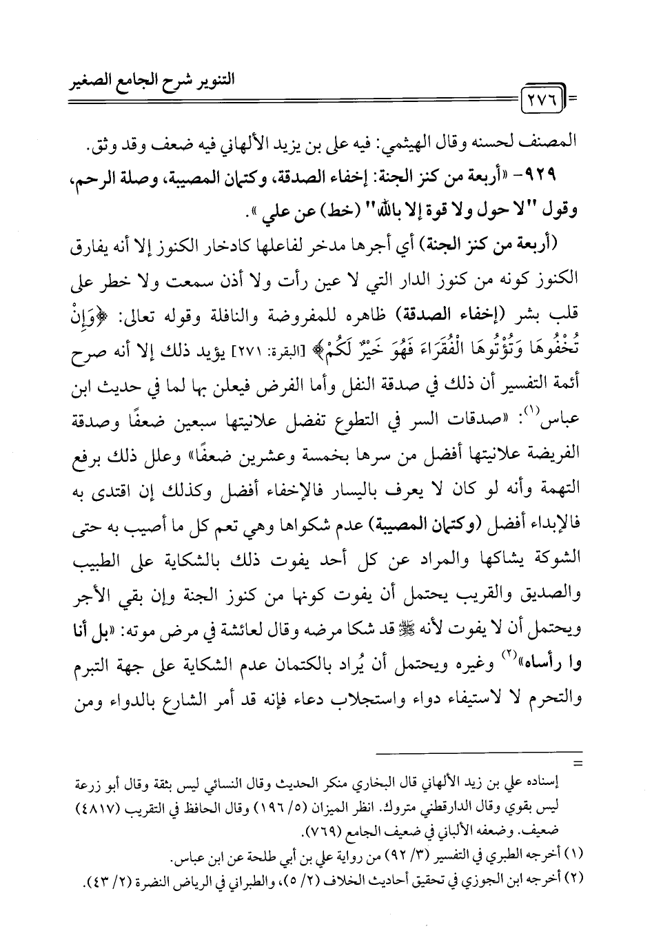 929 - "أربعة من كنز الجنة: إخفاء الصدقة، وكتمان المصيبة، وصلة الرحم، وقول "لا حول ولا قوة إلا بالله" (خط) عن علي".