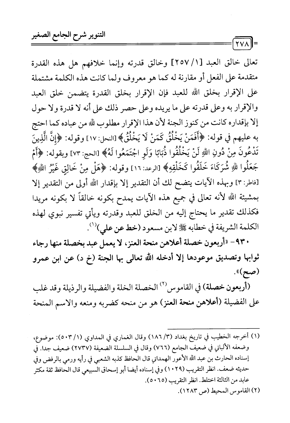 930 - "أربعون خصلة أعلاهن منحة العنز، لا يعمل عبد بخصلة منها رجاء ثوابها وتصديق موعودها إلا أدخله الله تعالى بها الجنة (خ د) عن ابن عمرو (صح) ".