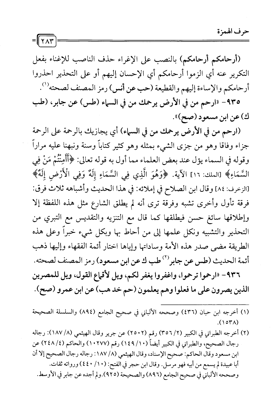 935 - "ارحم من في الأرض يرحمك من في السماء (طس) عن جابر، (طب ك) عن ابن مسعود (صح) ".