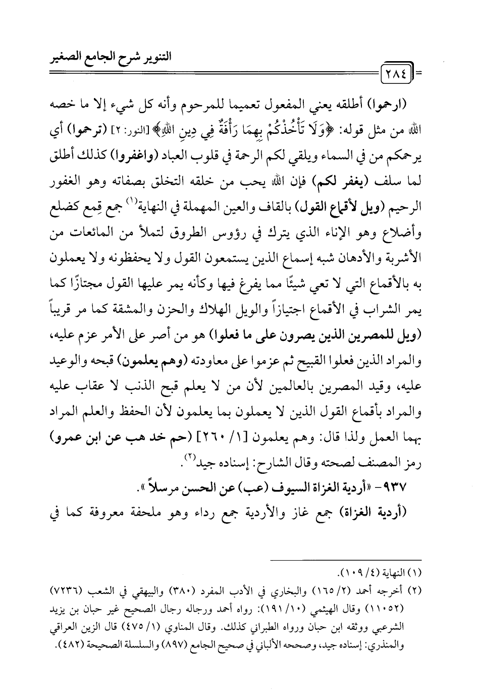 (ارحموا) أطلقه يعني المفعول تعميما للمرحوم وأنه كل شيء إلا ما خصه الله من مثل قوله: {وَلَا تَأْخُذْكُمْ بِهِمَا رَأْفَةٌ فِي دِينِ اللَّهِ} [النور: 2] (ترحموا) أي يرحمكم من في السماء ويلقي لكم الرحمة في قلوب العباد (واغفروا) كذلك أطلق لما سلف (يغفر لكم) فإن الله يحب من خلقه التخلق بصفاته وهو الغفور الرحيم (ويل لأقماع القول) بالقاف والعين المهملة في النهاية (¬1) جمع قِمع كضلع وأضلاع وهو الإناء الذي يترك في رؤوس الطروق لتملأ من المائعات من الأشربة والأدهان شبه إسماع الذين يستمعون القول ولا يحفظونه ولا يعملون به بالأقماع التي لا تعي شيئًا مما يفرغ فيها وكأنه يمر عليها القول مجتازًا كما يمر الشراب في الأقماع اجتيازاً والويل الهلاك والحزن والمشقة كما مر قريباً (ويل للمصرين الذين يصرون على ما فعلوا) هو من أصر على الأمر عزم عليه، والمراد الذين فعلوا القبيح ثم عزموا على معاودته (وهم يعلمون) قبحه والوعيد عليه، وقيد المصرين بالعالمين لأن من لا يعلم قبح الذنب لا عقاب عليه والمراد بأقماع القول الذين لا يعملون بما يعلمون لأن الحفظ والعلم المراد بهما العمل ولذا قال: وهم يعلمون [1/ 260] (حم خد هب عن ابن عمرو) رمز المصنف لصحته وقال الشارح: إسناده جيد (¬2).
