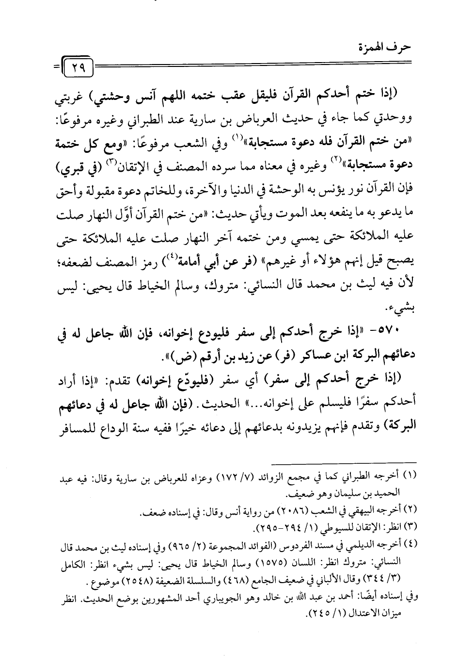570 - " إذا خرج أحدكم إلى سفر فليودع إخوانه، فإن الله جاعل له في دعائهم البركة ابن عساكر (فر) عن زيد بن أرقم (ض) ".
