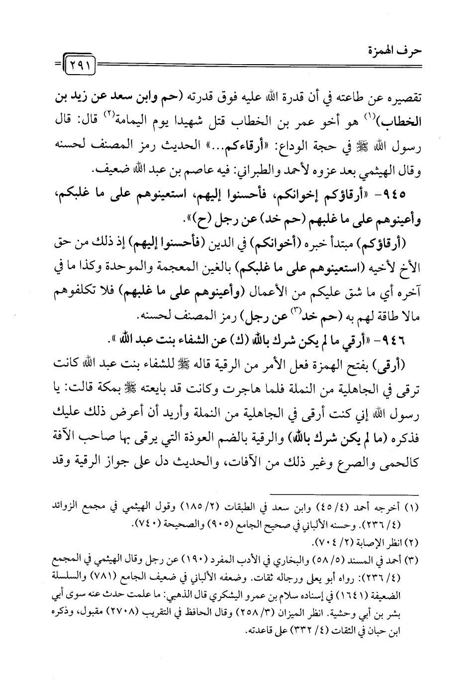 945 - "أرقاؤكم إخوانكم، فأحسنوا إليهم، استعينوهم على ما غلبكم، وأعينوهم على ما غلبهم (حم خد) عن رجل (ح) ".