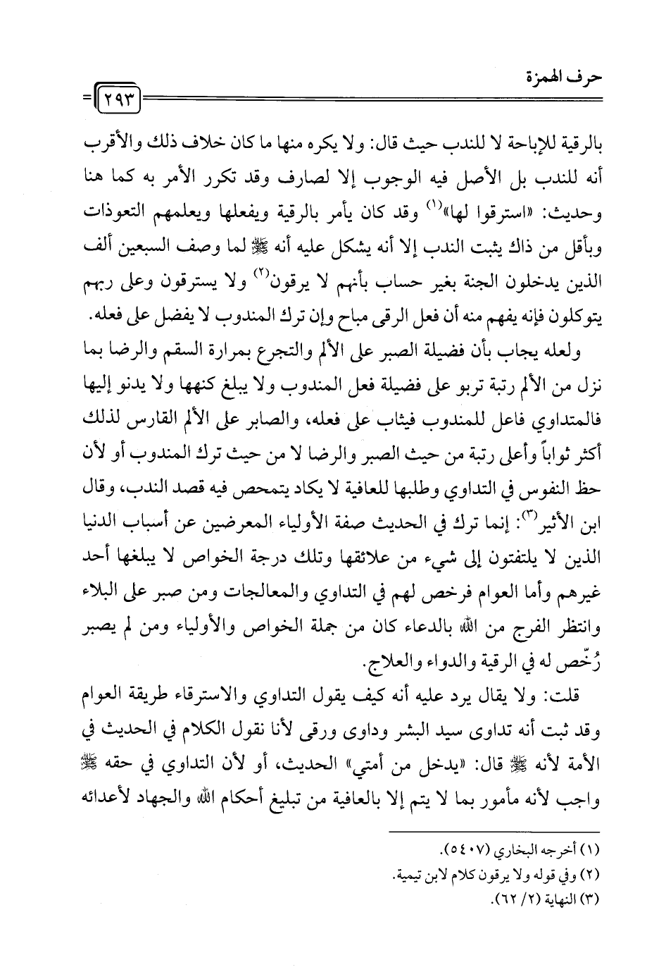 ولعله يجاب بأن فضيلة الصبر على الألم والتجرع بمرارة السقم والرضا بما نزل من الألم رتبة تربو على فضيلة فعل المندوب ولا يبلغ كنهها ولا يدنو إليها فالمتداوي فاعل للمندوب فيثاب على فعله، والصابر على الألم القارس لذلك أكثر ثوابًا وأعلى رتبة من حيث الصبر والرضا لا من حيث ترك المندوب أو لأن حظ النفوس في التداوي وطلبها للعافية لا يكاد يتمحص فيه قصد الندب، وقال ابن الأثير (¬3): إنما ترك في الحديث صفة الأولياء المعرضين عن أسباب الدنيا الذين لا يلتفتون إلى شيء من علائقها وتلك درجة الخواص لا يبلغها أحد غيرهم وأما العوام فرخص لهم في التداوي والمعالجات ومن صبر على البلاء وانتظر الفرج من الله بالدعاء كان من جملة الخواص والأولياء ومن لم يصبر رُخّص له في الرقية والدواء والعلاج.