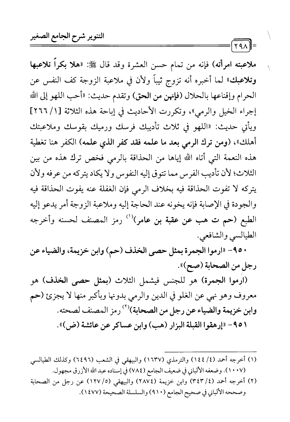 ملاعبته امرأته) فإنه من تمام حسن العشرة وقد قال - صلى الله عليه وسلم -: "هلا بكراً تلاعبها وتلاعبك" لما أخبره أنه تزوج ثيباً ولأن في ملاعبة الزوجة كف النفس عن الحرام وإقناعها بالحلال (فإنهن من الحق) وتقدم حديث: "أحب اللهو إلى الله إجراء الخيل والرمي"، وتكررت الأحاديث في إباحة هذه الثلاثة [1/ 266] ويأتي حديث: "اللهو في ثلاث تأديبك فرسك ورميك بقوسك وملاعبتك أهلك"، (ومن ترك الرمي بعد ما علمه فقد كفر الذي علمه) الكفر هنا تغطية هذه النعمة التي أتاه الله إياها من الحذاقة بالرمي فخص ترك هذه من بين الثلاث؛ لأن تأديب الفرس مما تتوق إليه النفوس ولا يكاد يتركه من عرفه ولأن يتركه لا تفوت الحذاقة فيه بخلاف الرمي فإن الغفلة عنه يفوت الحذاقة فيه والجودة في الإصابة فإنه يخونه عند الحاجة إليه وملاعبة الزوجة أمر يدعو إليه الطبع (حم ت هب عن عقبة بن عامر) (¬1) رمز المصنف لحسنه وأخرجه الطيالسي والشافعي.