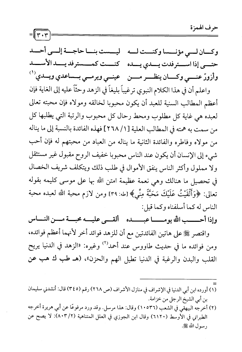 واعلم أن في هذا الكلام النبوي ترغيباً بليغاً في الزهد وحثًّا عليه إلى الغاية فإن أعظم المطالب السنية للعبد أن يكون محبوبا لخالقه ومولاه فإن محبته تعالى لعبده هي غاية كل مطلوب ومحط رحال كل محبوب والرتبة التي يطلبها كل من سمت به همته في المطالب العلية [1/ 268] فهذه الفائدة بالنسبة إلى ما يناله من مولاه وفاطره والفائدة الثانية ما يناله من العباد من محبتهم له فإن أحب شيء إلى الإنسان أن يكون عند الناس محبوبا خفيف الروح مقبول غير مستثقل ولا مملول وأكثر الناس ينفق الأموال في طلب ذلك ويتكلف شريف الخصال في تحصيل ما هنالك وهي نعمة عظيمة امتن الله بها على موسى كليمه بقوله تعالى: {وَأَلْقَيْتُ عَلَيْكَ مَحَبَّةً مِنِّي} [طه: 39] ومن لازم محبة الله لعبده محبة الناس له كما أسلفناه وكما قيل: