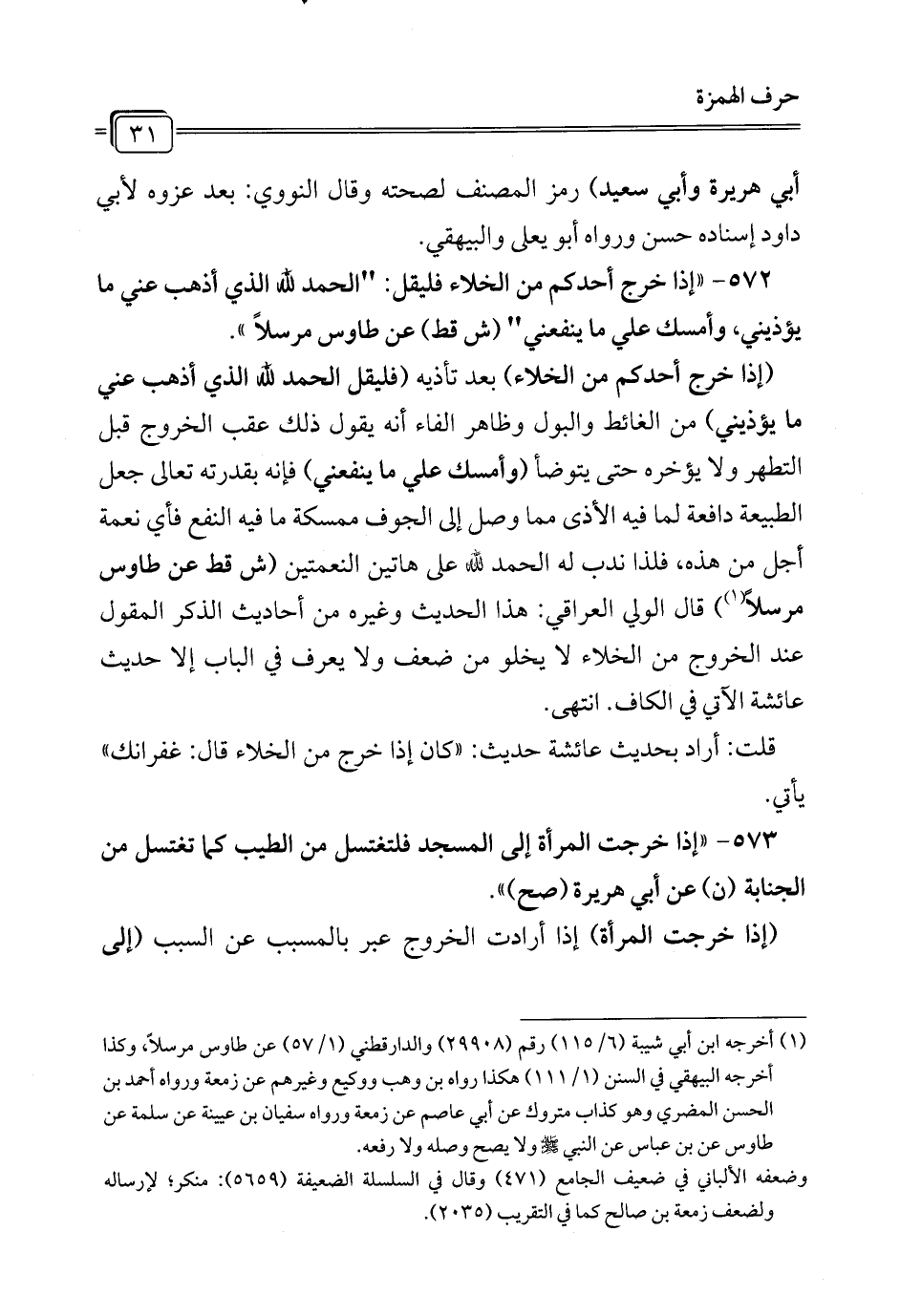 572 - " إذا خرج أحدكم من الخلاء فليقل: "الحمد لله الذي أذهب عني ما يؤذيني، وأمسك علي ما ينفعني" (ش قط) عن طاوس مرسلاً".