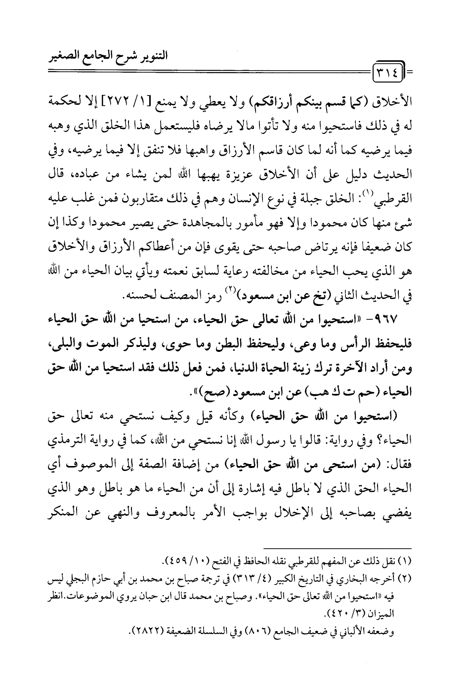 967 - "استحيوا من الله تعالى حق الحياء، من استحيا من الله حق الحياء فليحفظ الرأس وما وعى، وليحفظ البطن وما حوى، وليذكر الموت والبلى، ومن أراد الآخرة ترك زينة الحياة الدنيا، فمن فعل ذلك فقد استحيا من الله حق الحياء (حم ت ك هب) عن ابن مسعود (صح) ".