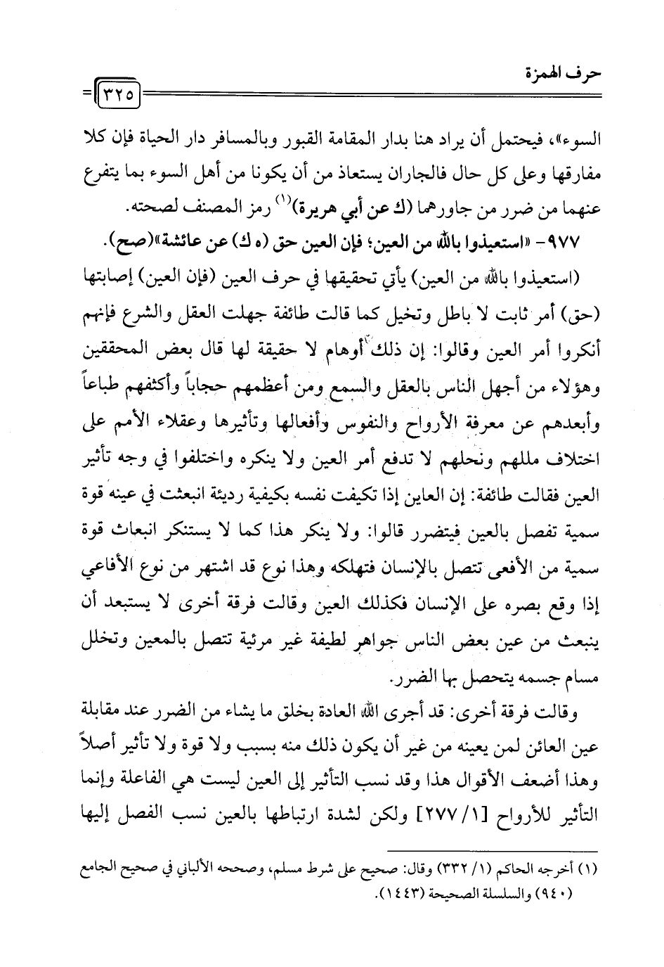 977 - "استعيذوا بالله من العين؛ فإن العين حق (هـ ك) عن عائشة" (صح).
