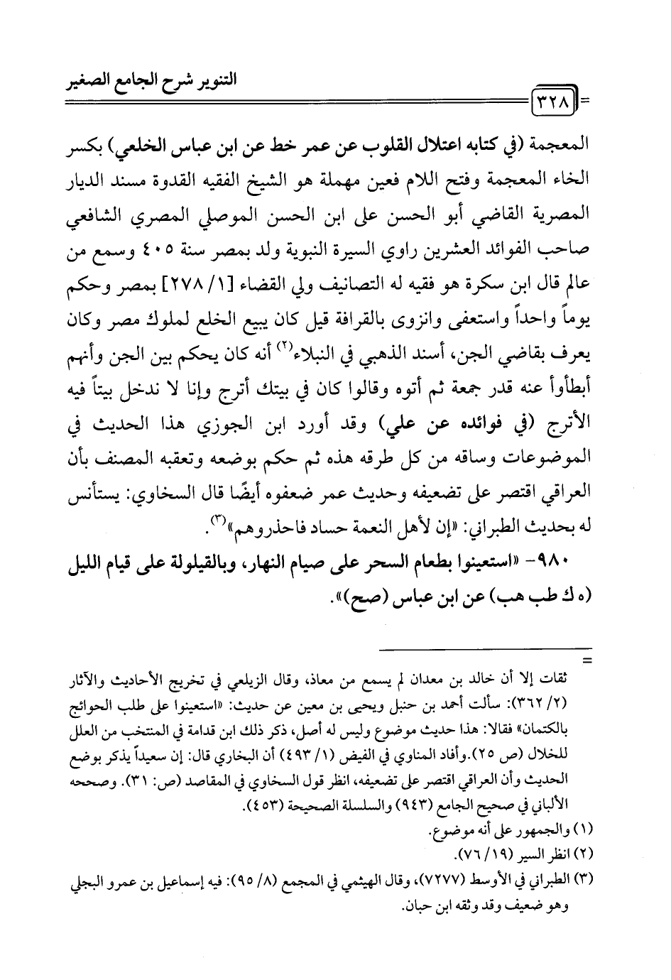 980 - "استعينوا بطعام السحر على صيام النهار، وبالقيلولة على قيام الليل (هـ ك طب هب) عن ابن عباس (صح) ".