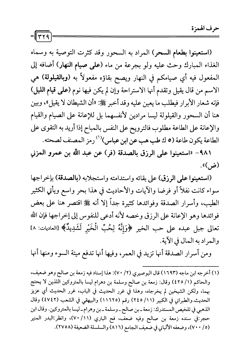 981 - "استعينوا على الرزق بالصدقة (فر) عن عبد الله بن عمرو المزني (ض) ".