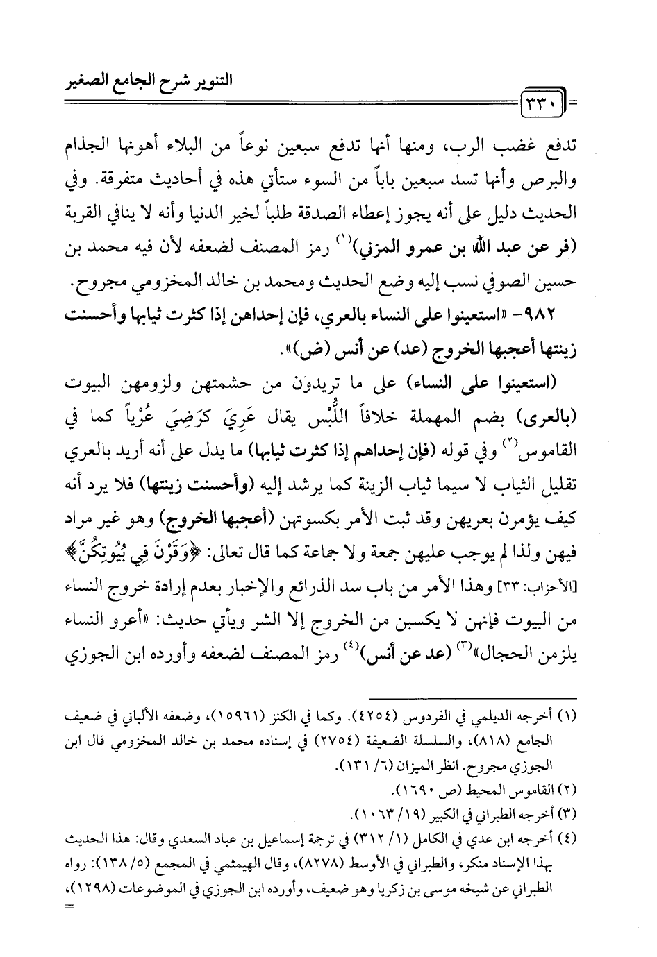 982 - "استعينوا على النساء بالعري، فإن إحداهن إذا كثرت ثيابها وأحسنت زينتها أعجبها الخروج (عد) عن أنس (ض) ".