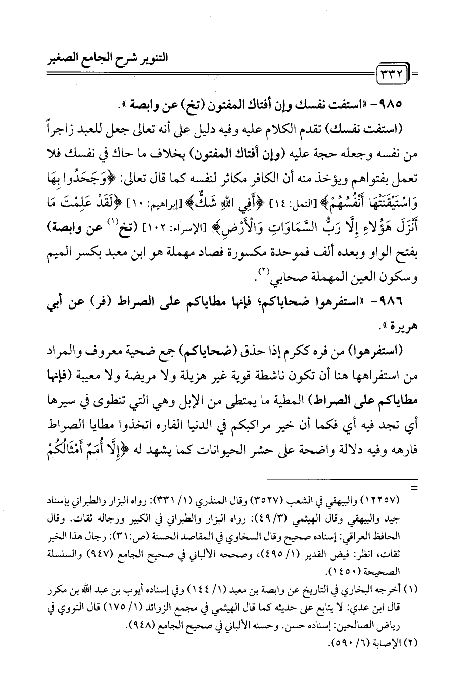 (استفت نفسك) تقدم الكلام عليه وفيه دليل على أنه تعالى جعل للعبد زاجراً من نفسه وجعله حجة عليه (وان أفتاك المفتون) بخلاف ما حاك في نفسك فلا تعمل بفتواهم ويؤخذ منه أن الكافر مكاثر لنفسه كما قال تعالى: {وَجَحَدُوا بِهَا وَاسْتَيْقَنَتْهَا أَنفُسُهُمْ} [النمل: 14] {أَفِي الله شَكٌّ} [إبراهيم: 10] {لَقَدْ عَلِمْتَ مَا أَنْزَلَ هَؤُلاءِ إِلَّا رَبُّ السَّمَاوَاتِ وَالْأَرْضِ] [الإسراء: 102] (تخ (¬1) عن وابصة) بفتح الواو وبعده ألف فموحدة مكسورة فصاد مهملة هو ابن معبد بكسر الميم وسكون العين المهملة صحابي (¬2).