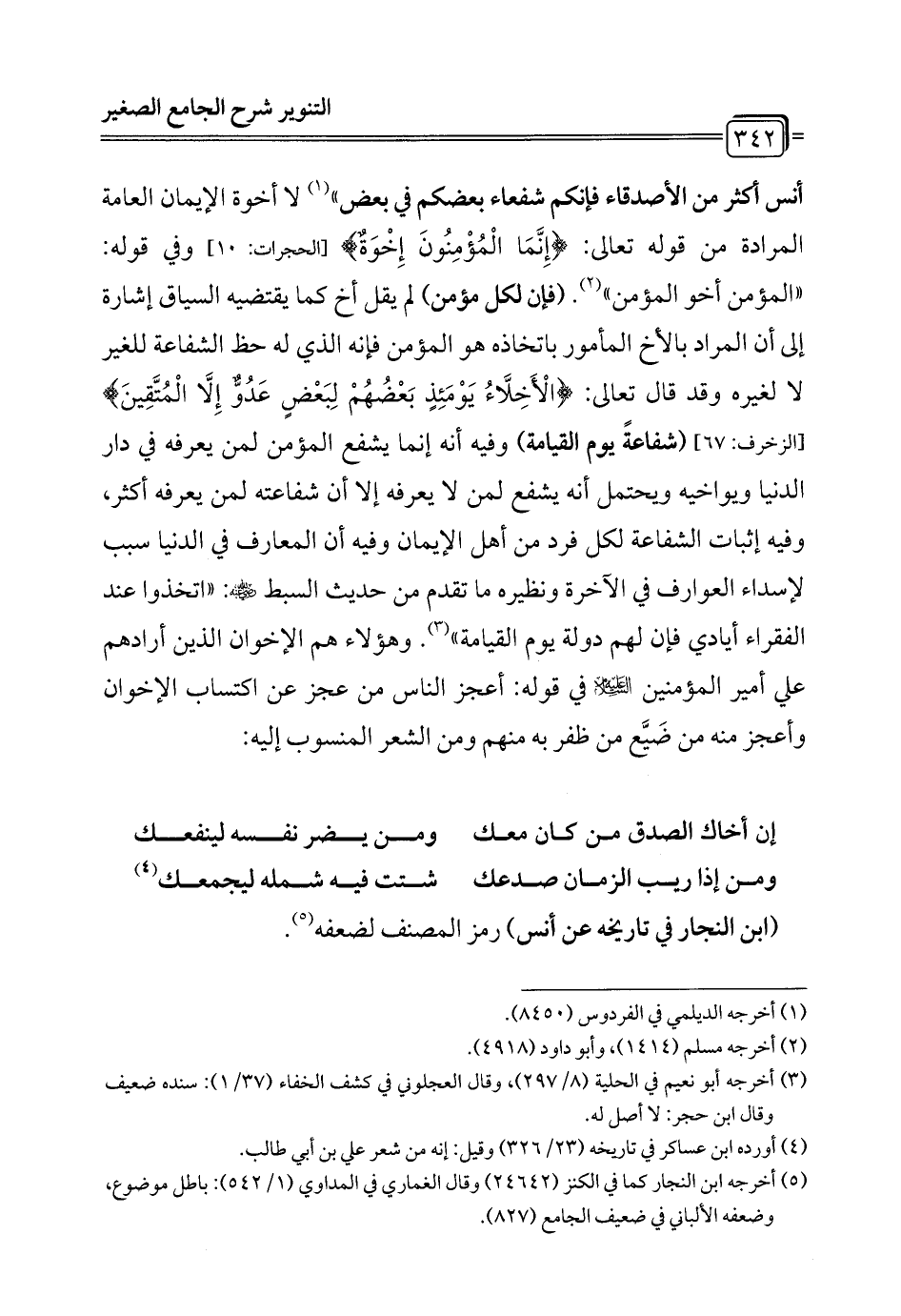 أنس كثر من الأصدقاء فإنكم شفعاء بعضكم في بعض" (¬1) لا أخوة الإيمان العامة المرادة من قوله تعالى: {إِنَّمَا الْمُؤْمِنُونَ إِخْوَة} [الحجرات: 10] وفي قوله: "المؤمن أخو المؤمن" (¬2). (فإن لكل مؤمن) لم يقل أخ كما يقتضيه السياق إشارة إلى أن المراد بالأخ المأمور باتخاذه هو المؤمن فإنه الذي له حظ الشفاعة للغير لا لغيره وقد قال تعالى: {الْأَخِلَّاءُ يَوْمَئِذٍ بَعْضُهُمْ لِبَعْضٍ عَدُوٌّ إِلَّا الْمُتَّقِينَ} [الزخرف: 67] (شفاعةً يوم القيامة) وفيه أنه إنما يشفع المؤمن لمن يعرفه في دار الدنيا ويواخيه ويحتمل أنه يشفع لمن لا يعرفه إلا أن شفاعته لمن يعرفه أكثر، وفيه إثبات الشفاعة لكل فرد من أهل الإيمان وفيه أن المعارف في الدنيا سبب لإسداء العوارف في الآخرة ونظيره ما تقدم من حديث السبط - رضي الله عنه -: "اتخذوا عند الفقراء أيادي فإن لهم دولة يوم القيامة" (¬3). وهؤلاء هم الإخوان الذين أرادهم علي أمير المؤمنين -عليه السلام- في قوله: أعجز الناس من عجز عن اكتساب الإخوان وأعجز منه من ضَيَّع من ظفر به منهم ومن الشعر المنسوب إليه: