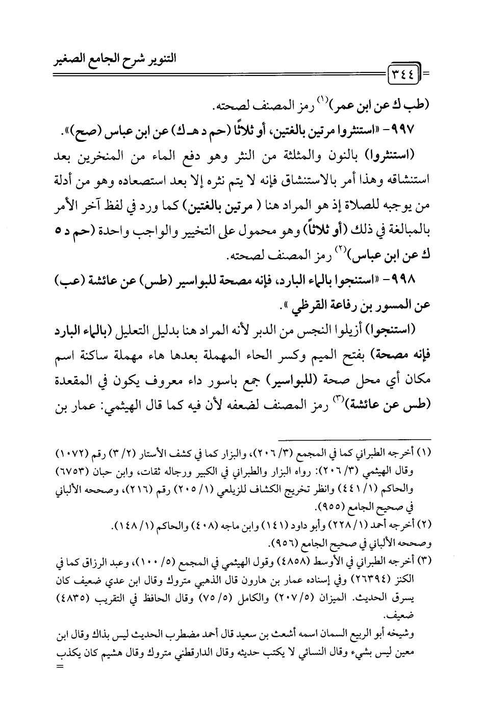 998 - "استنجوا بالماء البارد، فإنه مصحة للبواسير (طس) عن عائشة (عب) عن المسور بن رفاعة القرظي".