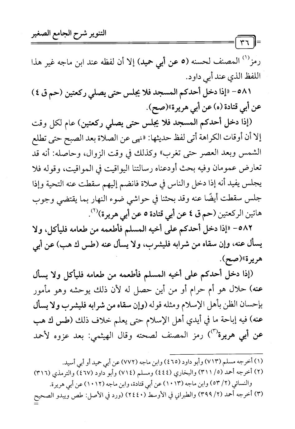 581 - " إذا دخل أحدكم المسجد فلا يجلس حتى يصلي ركعتين (حم ق 4) عن أبي قتادة (هـ) عن أبي هريرة" (صح).