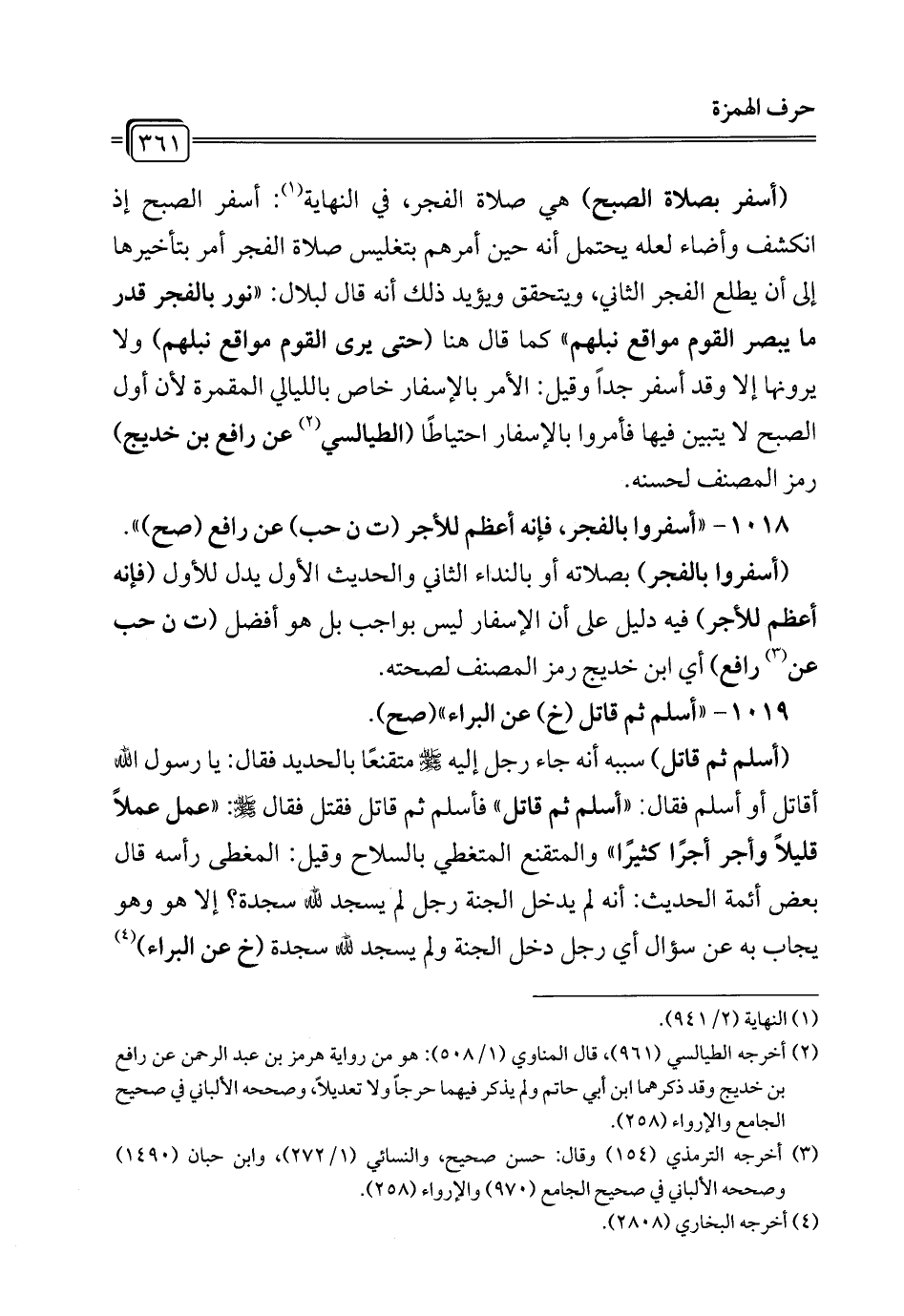 1018 - "أسفروا بالفجر، فإنه أعظم للأجر (ت ن حب) عن رافع (صح) ".