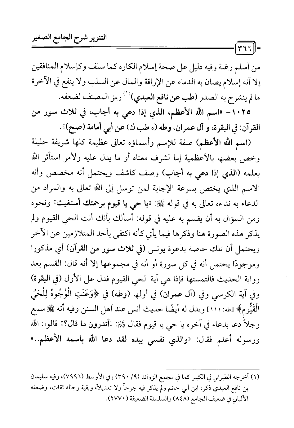 1025 - "اسم الله الأعظم، الذي إذا دعي به أجاب، في ثلاث سور من القرآن: في البقرة، وآل عمران، وطه (هـ طب ك) عن أبي أمامة (صح) ".
