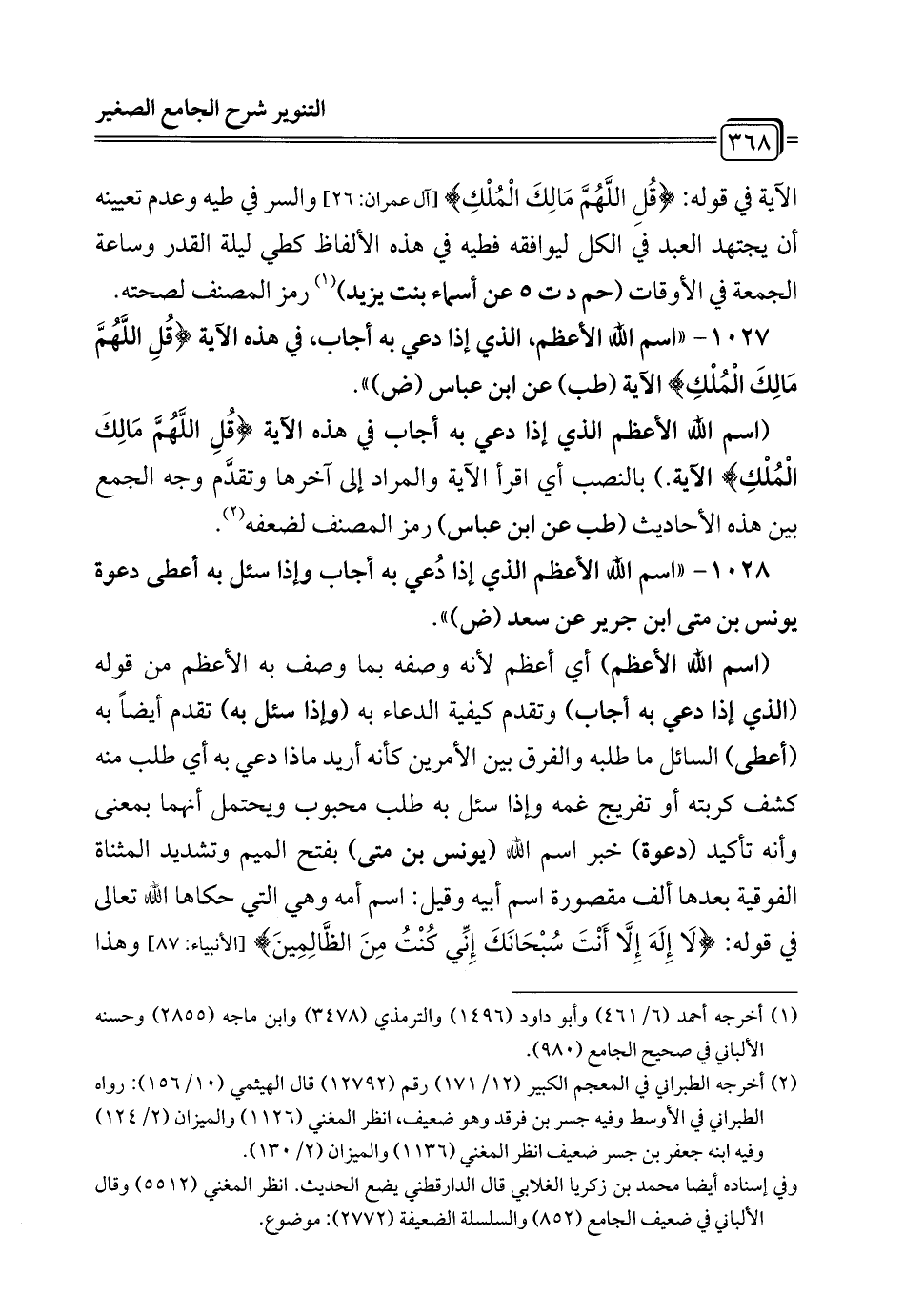 1027 - "اسم الله الأعظم، الذي إذا دعي به أجاب، في هذه الآية {قُلِ اللَّهُمَّ مَالِكَ الْمُلْكِ} الآية (طب) عن ابن عباس (ض) ".