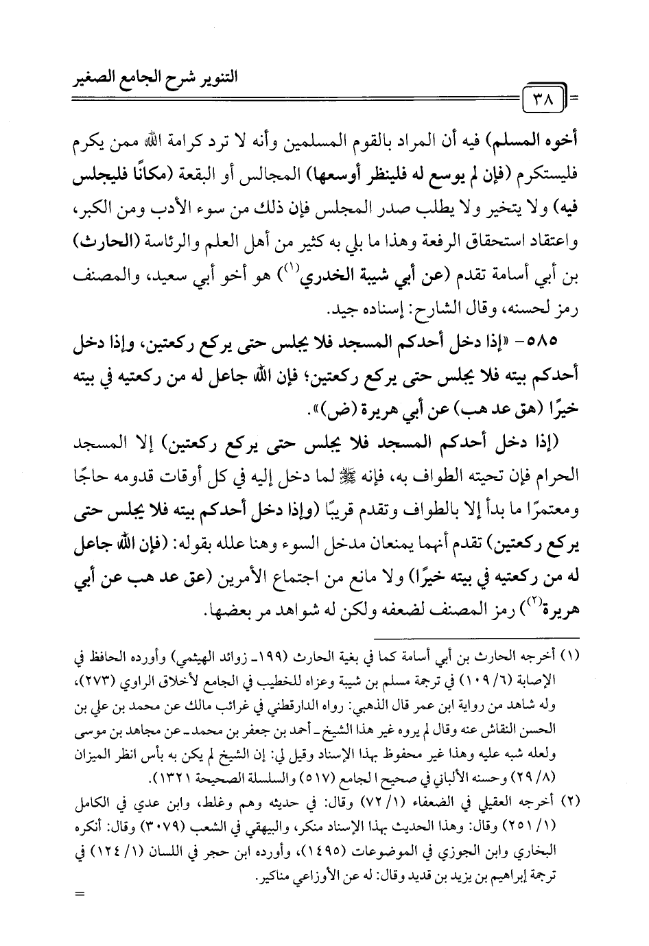 585 - " إذا دخل أحدكم المسجد فلا يجلس حتى يركع ركعتين، وإذا دخل أحدكم بيته فلا يجلس حتى يركع ركعتين؛ فإن الله جاعل له من ركعتيه في بيته خيرًا (هق عد هب) عن أبي هريرة (ض) ".