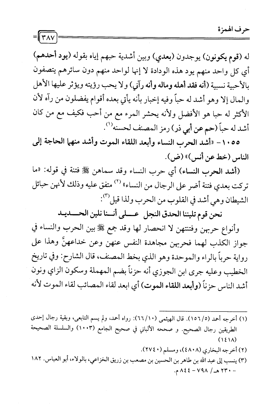1055 - "أشد الحرب النساء وأبعد اللقاء الموت وأشد منهما الحاجة إلى الناس (خط عن أنس) " (ض).