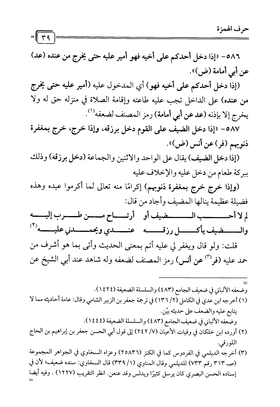 586 - " إذا دخل أحدكم على أخيه فهو أمير عليه حتى يخرج من عنده (عد) عن أبي أمامة (ض) ".
